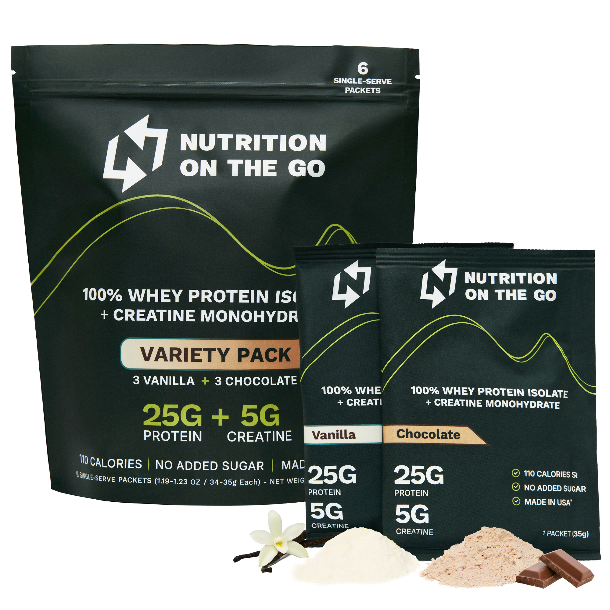 Nutrition on the Go’s 6-Pack Sampler offers individually portioned protein and creatine packets for easy use at the gym, while traveling, or during busy days. Designed for convenience and travel, these single-serve packets help support fitness goals wherever you are.